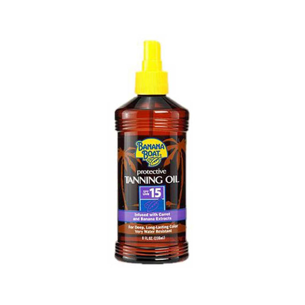 Banana Boat Protective Tanning Oil Spray with SPF 15 will help you achive a golden tan while protecting you form the sun. This formula is infused with Vitamins A and E to condition your skin while you tan. Size: 8 oz. 1 Each.