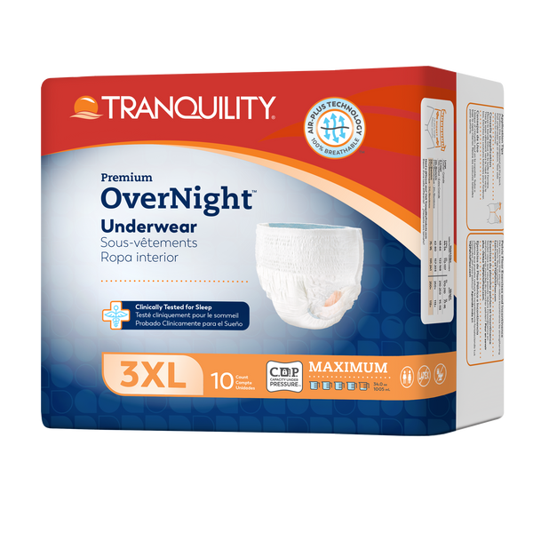 Tranquility® Premium OverNight™ Disposable Absorbent Underwear provide maximum capacity for uninterrupted sleep. Larger sizes hold over 1 qt of fluid. The peach core guarantees skin dryness, odor reduction and urine pH neutralization. Clothlike outer layer with breathable sides and an ample, full-rise waist panel provide a more proportioned fit. Kufguards® (inner leg cuffs) channel fluids into the core, helping to contain high-volume urge episodes and bowel incontinence. Tear-away side seams allow for easy removal. Blue leg elastics indicate overnight protection. Latex-free.